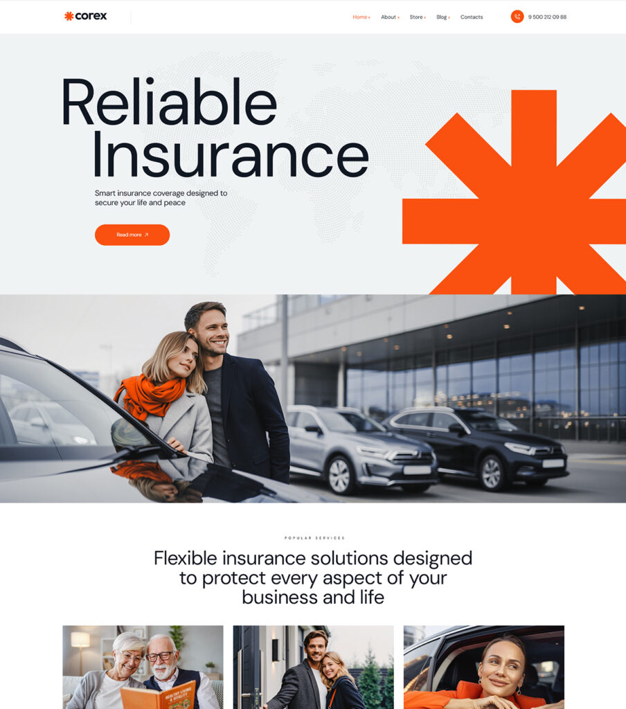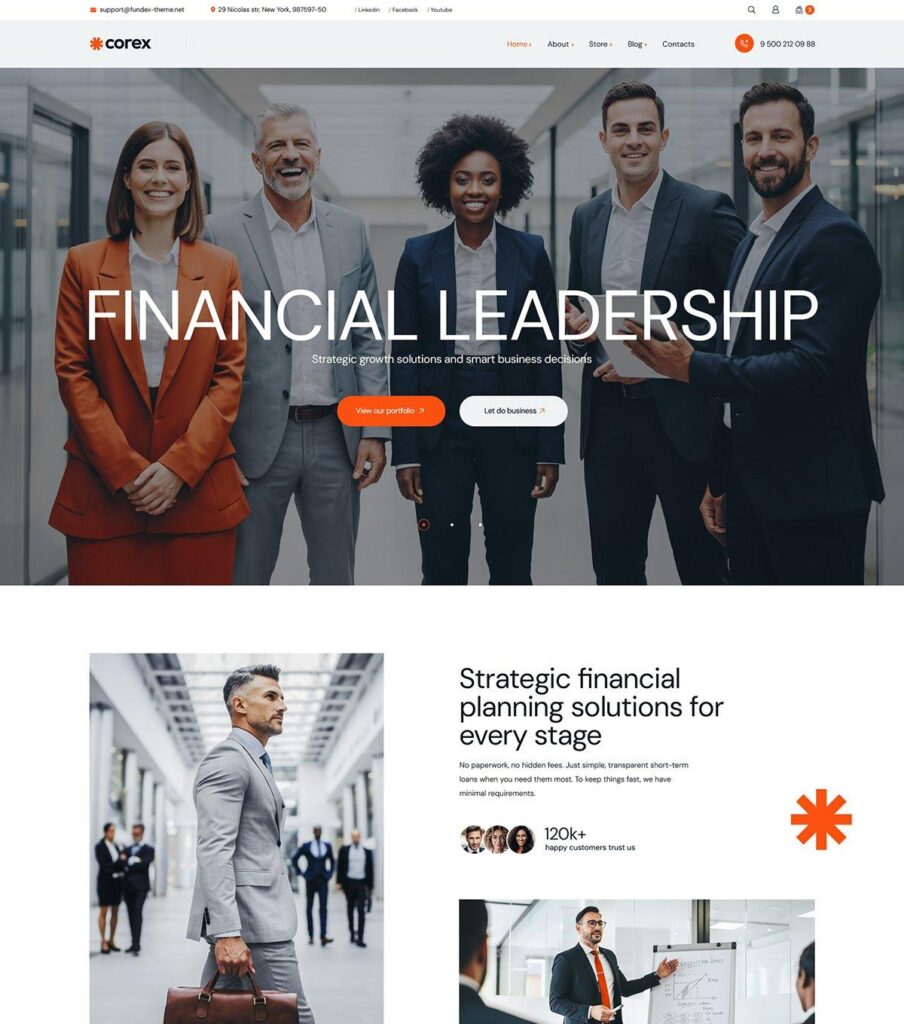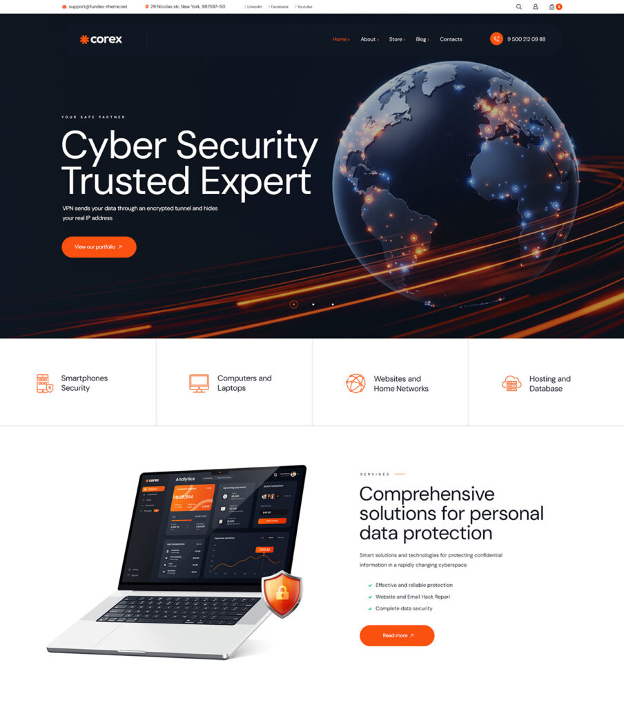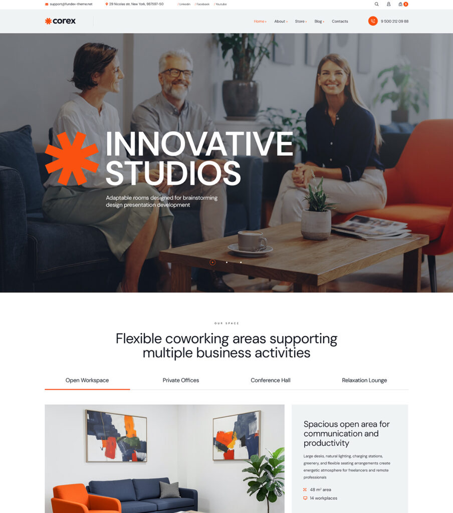 The theme also includes pre-built inner pages such as online store, blogs, contacts and many others